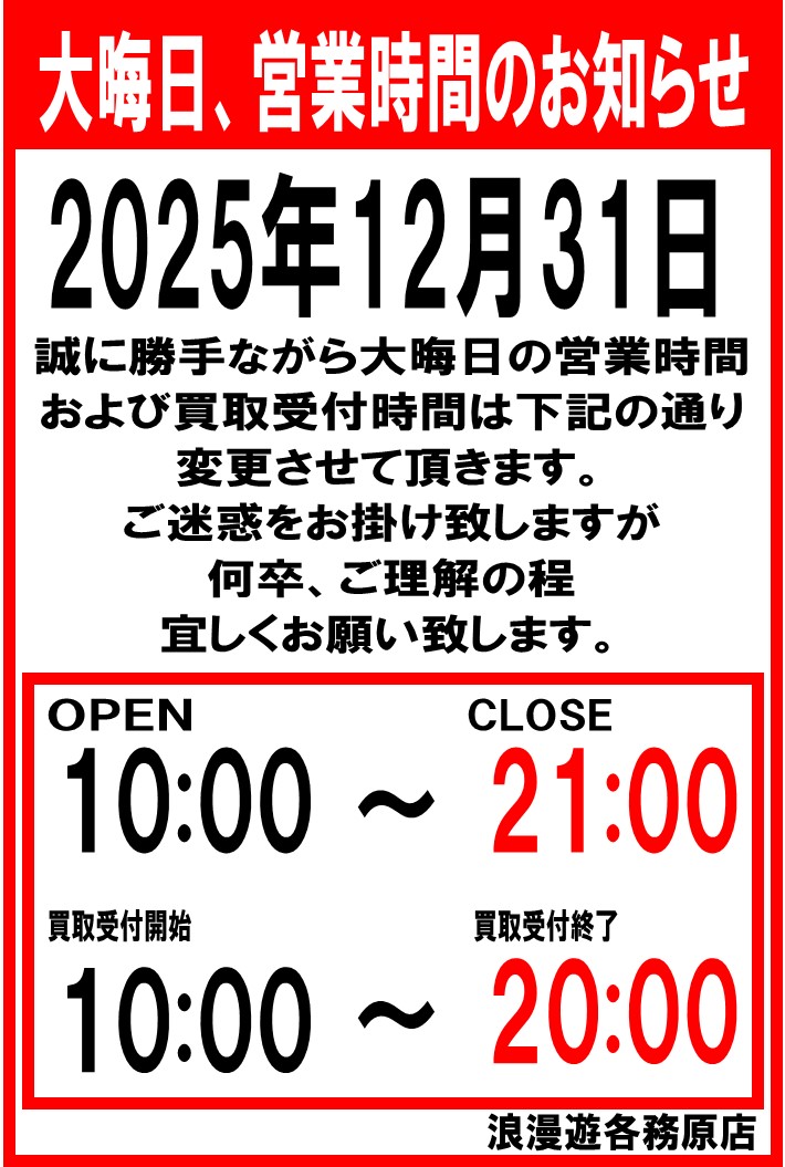 12月31日の営業時間を以下の通り変更させて頂きます。